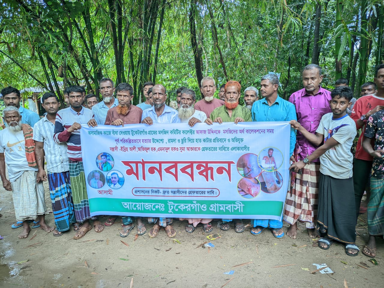 দোয়ারাবাজারে মসজিদের টাকা কালেকশন’র সময় যুবকের হাত কাটায় জড়িতদের গ্রেফতারের দাবিতে মানববন্ধন